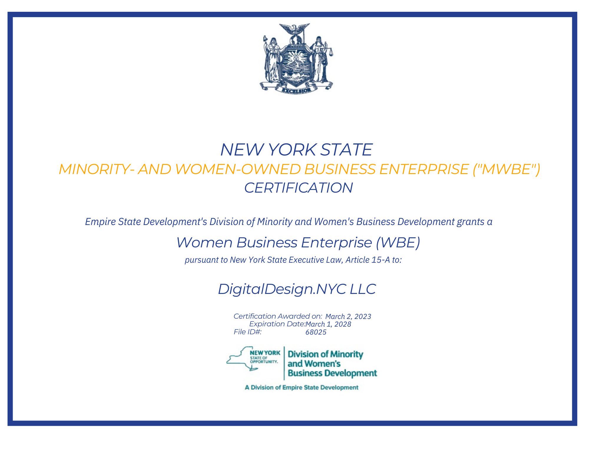 Empire State Development's Divison of Minority and Women's Business Development grants a Women Business Enterprise (WBE) pursuant to New York State Executive Law, Article 15-A to: Legacy Design Hub d/b/a/ Legacy Design Hub on March 2, 2023